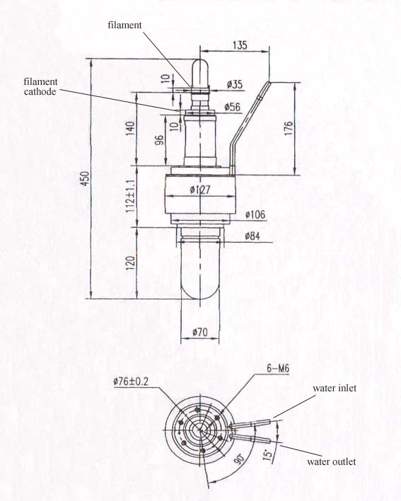 GGCK-50型連續(xù)波磁控管是33厘米,固定頻率,全金屬陶瓷結(jié)構(gòu),直熱式純鎢陰極的大功率微波管。磁場(chǎng)由外附電磁鐵提供,管體水冷、陰極引出部分風(fēng)冷,微波能量從軸向天線輸出,可直接激勵(lì)矩形波導(dǎo),供微波加熱作功率源用。